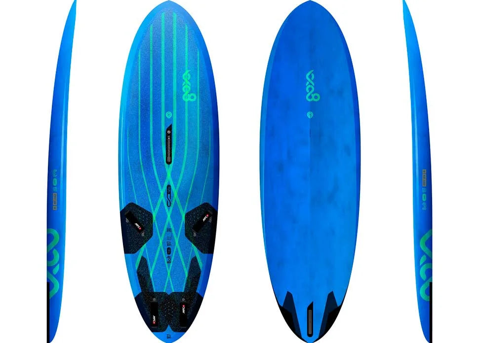 Blended rails offer impressive speed while facilitating rewarding jibes and maneuvers, making every ride a thrilling experience. The deck features Full Carbon Deck technology with Vacuum lamination and a recessed mast track for a low rig connection, enhancing stability and control.